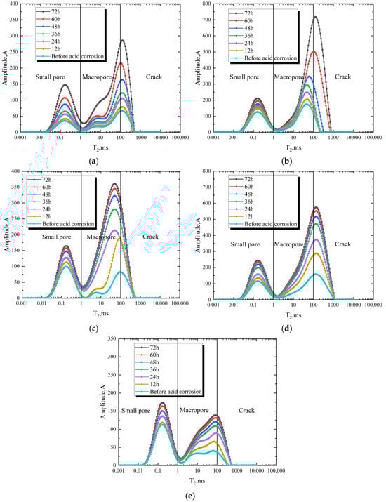 T2 spectrum of acid corrosion characteristics. (a) CH3COOH (15%). (b) HF (15%). (c) HCl (15%). (d) Mud acid (12%HCl + 3%HF). (e) Mixed acid (7%HCl + 3%HF + 5%CH3COOH).