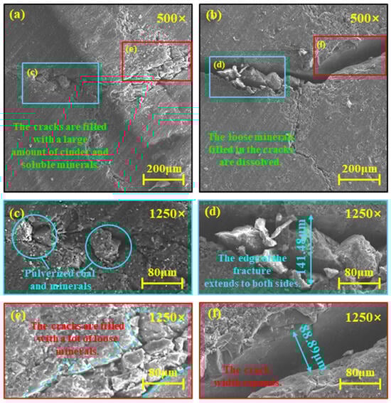 Figure 4 shows the comparison of the morphology of coal rock cracks before and after dissolution. It is found that the original coal sample cracks are “T”-shaped, and the cracks are filled with large amounts of loose mineral debris. After acid treatment, most of the minerals in the cracks are dissolved and disintegrate. The cracks change from filling cracks to local filling cracks. The edge of the cracks expands to both sides, and the maximum crack width is 141.48 μm [17,40].
