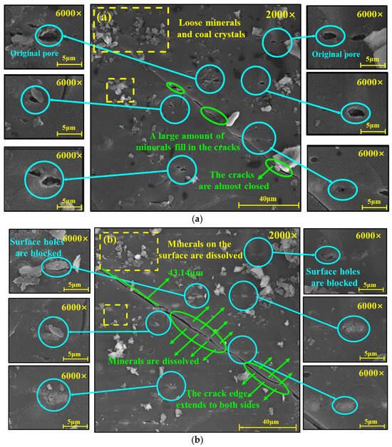 Figure 5 shows the scanning electron microscope imaging comparison before and after the dissolution of the smooth matrix surface. Before the dissolution, there were 6 obvious primary micropores on the surface of the coal sample, and large numbers of loose minerals were gathered and distributed. At the same time, some minerals were located in the cracks, and the cracks were almost closed. After acid dissolution, six primary micropores on the surface of the matrix were blocked by the slag, the mineral aggregates were dissolved and disintegrated, the fracture width increased, some minerals located in the fracture were dissolved and disintegrated, and the fracture was obviously open [11,40].