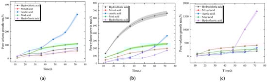 As shown in Figure 6a, the growth rate of smaller pores in terms of volume, after the dissolution of coal rock core by different types of acid solution, is 157.37–428.09%. The growth rate of smaller pores in terms of volume after the dissolution of coal rock by acetic acid after 12 h is greater than that of the other four acid solutions, and the growth rate of the smaller pores in terms of volume is 328.09%. Within 12–36 h, the growth rate curve of smaller pores of acetic acid showed a gentle upward trend, indicating that the dissolution rate of acetic acid to coal rock was relatively stable. Within 36–72 h, the growth rate curve of smaller pores of acetic acid increased continuously, indicating that the dissolution of smaller pores of coal rock by acetic acid was enhanced. The change in the hydrofluoric acid curve showed a gentle trend within 12–36 h, and a slight increase was observed within 36–72 h. However, the overall pore volume growth rate did not change significantly, remaining between 17.65% and 68.10%. The pore volume growth rate curves of mud acid, mixed acid, and hydrochloric acid showed a steady rise in 12–36 h, and the curve tended to be gentle during 36–72 h, indicating that the dissolution effect of mud acid, mixed acid, and hydrochloric acid when applied to the smaller pores of coal rock was mainly concentrated in 12–36 h.