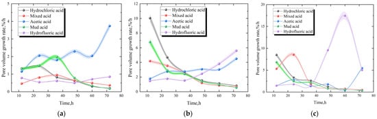 Figure 7a shows the variation curve of the pore volume growth rate. We found that the pore volume growth rate increases gradually after the dissolution of smaller pores by acetic acid. At the end of the experiment, the pore volume growth rate reached 3.7%, which was much larger than the pore volume growth rate of other acids. The result indicates that acetic acid has a strong dissolution effect on small pores of coal rock and has a significant impact. The dissolution effect of mud acid and mixed acid on coal rock reached the best effect at about 36 h. With the extension of time, the dissolution effect gradually weakened. Hydrochloric acid showed a consistent downward trend in terms of the dissolution characteristics of different pore sizes. During the experiment, the overall pore volume growth rate of hydrofluoric acid changed relatively little, and the overall performance was gentle, <1%/h.
