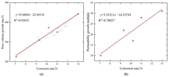 Correlation analysis of the pore volume growth rate, the permeability growth multiple, and the dissolution rate. (a) The correlation between the pore volume growth rate and dissolution rate. (b) The correlation between the permeability growth multiple and dissolution rate.