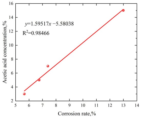 According to the results of the correlation degree between the three acids and the dissolution rate of coal rock, shown in Table 7, the correlation degree between acetic acid and the dissolution rate of coal rock was the largest, standing at 28.86, followed by that of hydrochloric acid; hydrofluoric acid had the weakest correlation. This shows that acetic acid has the greatest influence on the dissolution rate of coal rock, and hydrochloric acid and hydrofluoric acid have a weak influence on the dissolution rate of coal rock. We further clarify the influence of acetic acid on the dissolution rate of coal and rock, working according to the correlation analysis of acetic acid concentrations and the dissolution rates of the different solutions in Table 3, with results shown in Figure 9.