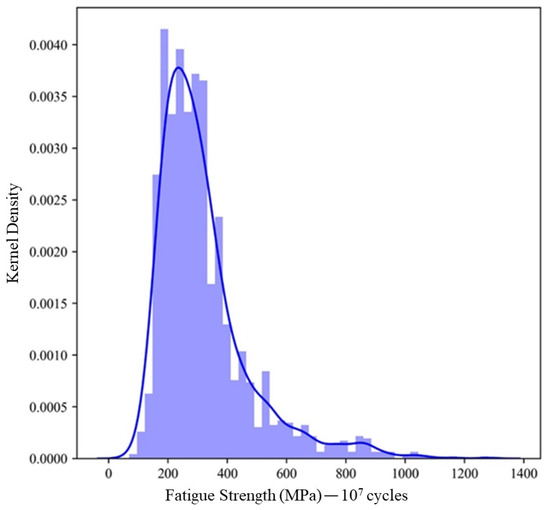 The distribution of the predicted output fatigue strength in the dataset was thoroughly analyzed and visualized by plotting its kernel density line and histogram, as illustrated in Figure 3. This analysis offers valuable insights into the overall distribution pattern of the predicted fatigue strength values, providing a clear understanding of their range and variability.