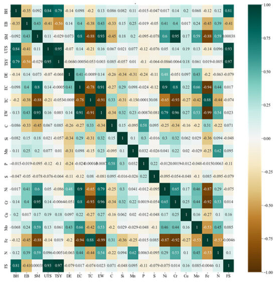 Figure 4 reveals strong correlations between fatigue strength and certain mechanical properties, such as ultimate tensile strength, Brinell hardness, and yield strength. The correlation coefficients for these parameters exceed 0.8, indicating a robust relationship. Additionally, the Fe, Ni, and Cr contents in the alloy show strong correlations with other variables such as electrical conductivity (EC), thermal conductivity (TC), and elastic modulus (EW). Moreover, Fe content exhibits a negative correlation with the content of rare elements. To comprehensively investigate the factors influencing the fatigue strength of ferrous alloys, all 20 collected features were used as inputs for the prediction model, ensuring that the model captures the complex relationships between the features and the target variable.