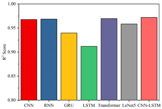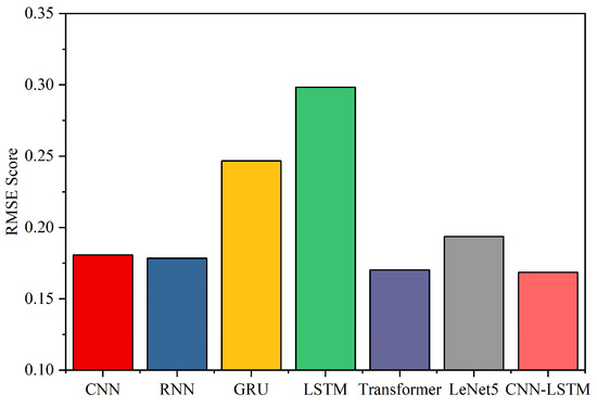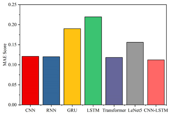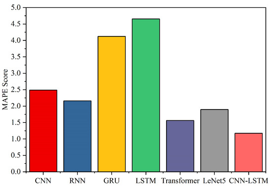 From an analysis of the above table, it is found that the R2 of the CNN-LSTM fatigue strength prediction model is improved by 0.4% and 6.2%, the RMSE is reduced by 7.2% and 77%, the MAE is reduced by 7.9% and 60.40%, and the MAPE is reduced by 112% and 297% compared to the CNN and LSTM models. Therefore, CNN-LSTM outperforms individual models, and integrating them leads to better prediction of metal fatigue strength. Compared with RNN, GRU, Transformer, and LeNet5 models, CNN-LSTM improves R2 scores by 0.3%, 0.3%, 0.2%, and 1.4%, reduces RMSE by 5.9%, 46.4%, 0.9%, and 14.9%, and reduces MAE by 7.1%, 69.5%, 5.4%, and 39.1%, respectively; MAPE decreases by 84.1%, 251.2%, 33.2%, and 61.6%, respectively. It is shown that the proposed model has a better ability to predict the fatigue strength of metals in comparison with other advanced models, highlighting the superiority of the proposed model. Figure 5, Figure 6, Figure 7 and Figure 8 present a graphical comparison of the scores for MAE, RMSE, R2, and MAPE for all models.