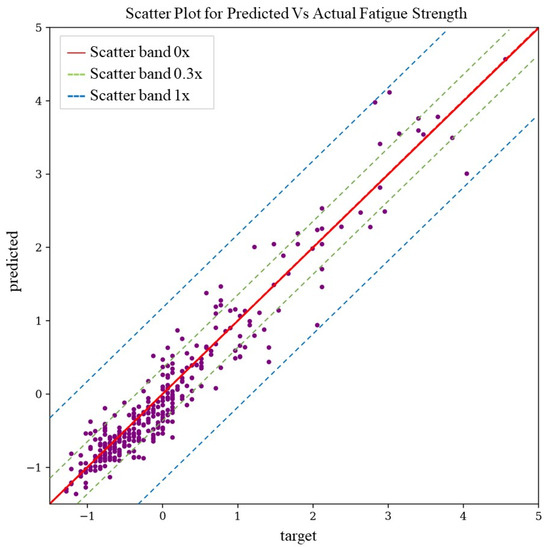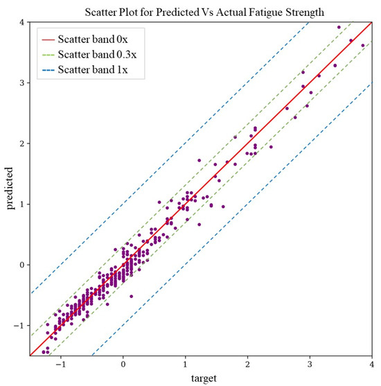 Comparing the R2, RMSE, MAE, and MAPE evaluation scores of the models, it is found that the CNN-LSTM have the best ability to predict fatigue intensity, with the largest R2, which is higher than the rest of the six evaluation metrics scores. The LSTM prediction model has the worst prediction ability, with the smallest R2. The dispersion of fatigue strength predictions for all regression models on the same test set of data is shown in Figure 9, Figure 10, Figure 11, Figure 12, Figure 13, Figure 14 and Figure 15.
