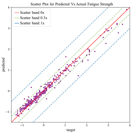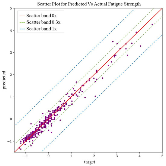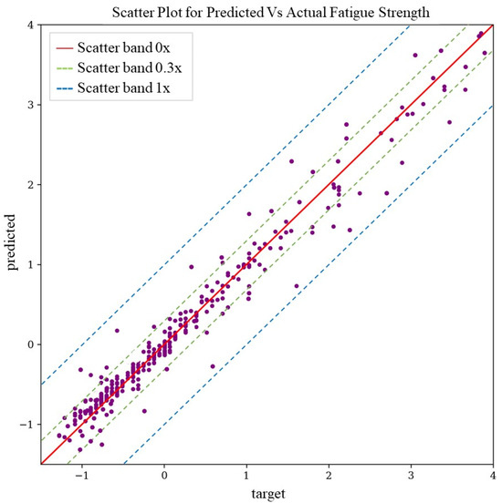 Before training the predictive model and making fatigue strength predictions, the dataset was randomly divided into two subsets: a training set and a test set. In this paper, an 80% random selection of samples was assigned to the training dataset, while the remaining 20% was allocated to the test dataset. This partitioning strategy ensures a fair evaluation of the model’s performance on unseen data.