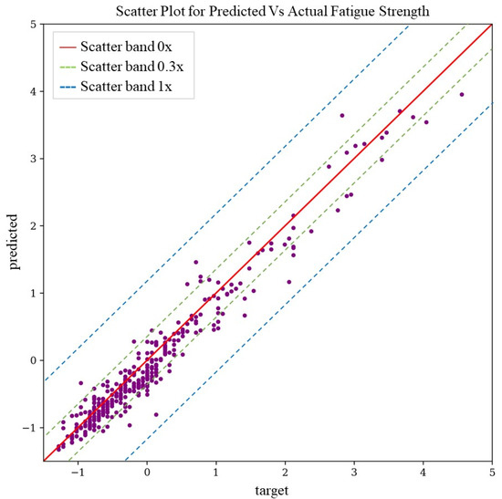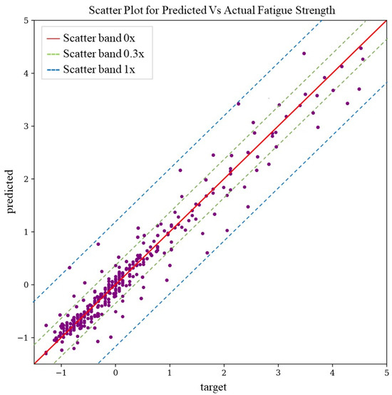 Using Z-score normalization as described in Equation (1), the fatigue strength values are scaled to values between −1.5 and 5. Among the seven deep learning fatigue strength prediction models, the CNN-LSTM model has the best predictive ability with predictions closer to the contour line than the experimental values, and the Z-score normalized fatigue strength predictions are greater than 1.0; the predictions of LSTM, Transformer, and LeNet5 models deviate more from the ±0.3 scatter band than the experimental values. The difference between the LSTM, Transformer, and LeNet5 model predictions and the experimental values deviate more from the ±0.3 scatter line, and the predictions are more in the range of 0.3 to 1.0 scatter line, while the CNN, GRU and RNN predictions deviate less from the 0.3 scatter line. A larger number of the data points in the CNN-LSTM are in the range of the 0.3 scatter line, which indicates that the fatigue strength predictions are highly accurate in this range. For normalized fatigue strengths from −0.5 to 1.5, the predictions of the proposed model are symmetrically distributed around the scatter bands with dense data points. Most of the data points lie within the 0.3 scatter band, with only a few outliers located between the 0.3 and 1.0 scatter bands, and no predictions outside the 1.0 scatter band. Overall, these results indicate that the CNN-LSTM model has excellent prediction performance.