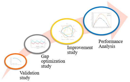 Vertical-axis wind turbines are classified as drag and lift types based on blade aerodynamic analysis. Savonius wind turbines are drag-type, and Darrieus wind turbines are lift-type vertical-axis wind turbines. Within the scope of this study, drag-type vertical-axis wind turbines with three blades and a gap distance are considered. The blade profiles used in this wind turbine are semicircular, as in classical Savonius wind turbines. At the same time, these blades are designed to be separate, i.e., a gap between them, like the blades in H-type Darrieus wind turbines. Since the drag force is generated on the blades due to the blade profile used, these turbines are also drag-based vertical-axis wind turbines. The numerical investigation of the performance of the three-bladed drag-type vertical-axis wind turbines with a gap considered in this study was carried out in the form of validation, gap optimization, improvement, and performance analysis studies, respectively, as shown in Figure 1. As can be seen in the figure, firstly, the numerical solution model was validated with experimental data in the literature. Thus, the accuracy of the numerical model to be used throughout the study was supported by experimental results. In the gap optimization studies, the effect of the gap distance on the wind turbine performance was investigated by keeping the aspect ratio of the vertical-axis wind turbine constant. At the same time, a performance setup was also placed in front of the turbine without making any changes to the turbine, and the changes in the turbine design parameters on the turbine performance were examined. Subsequently, improvement studies were carried out by changing the number of blades while keeping the optimum gap distance constant for the three-bladed vertical-axis wind turbine. Turbine design with optimum blade number was also determined from the improvement studies. In the gap and improvement studies, torque coefficients were determined from the wind turbine performance values and compared with each other. Thus, performance analyses of the turbines with the obtained optimum gap distance and blade number were carried out. Torque and power coefficients were determined in the performance analysis of the determined optimum design turbine.
