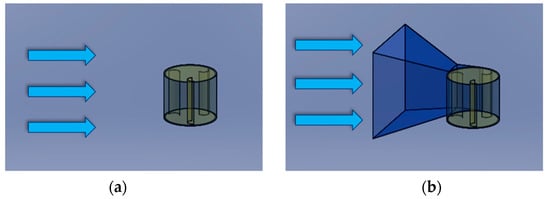 When literature studies were examined, especially in terms of drag-type Savonius wind turbines, it was determined that design changes or additions made inside or outside the turbine to increase turbine performance []. As a result of these studies, the effect of the gap distance on the turbine performance was investigated, especially for the vertical-axis turbine designed in this study, with the use of the external design setup used to increase the performance of vertical-axis wind turbines. In order to examine the effect of gap distances, the dimensions of the external design performance setup were kept constant. The gap optimization study conducted within the scope of this study was carried out both without and with performance setup, as shown in Figure 2. Thus, the effect of the performance setup on the gap distance was determined.