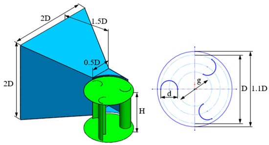 The geometric parameters of the three-bladed vertical-axis wind turbine and the performance setup are shown in Figure 3. The angles between the three blades placed inside the turbine were taken as equal. The geometric parameters of the vertical-axis wind turbine were turbine diameter (D), turbine height (H), blade end plate diameter D0 = 1.1D, blade diameter (d), and the gap distance between the blades (g). Throughout the study, the turbine diameter was taken as constant as D = 50 cm. The dimensions of the performance setup are also shown in the figure according to the turbine diameter.