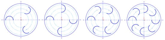 Since the turbine diameter was kept constant throughout the study, the dimensions of the performance setup were also indirectly kept constant. Thus, the effects of the internal design parameters of the turbine were investigated by keeping the external dimensions of the turbine and the dimensions of the performance setup constant throughout the study (Table 1). For this purpose, the aspect ratio of the turbine used in this study was the same, namely, D/H = 1. The gap between the blades was designed in certain ratio according to the diameter of the vertical-axis wind turbine. This gap ratio (GR) is the ratio of gap distance to the turbine diameter, GR = g/D. The gap ratio (GR) was varied between 20% and 70%. Thus, the turbine blade diameters were reduced at increasing gap distances, and the main turbine diameter was kept constant throughout the study. On the contrary, in the case of the opposite, the main dimensions of the turbine were also kept constant. According to the literature reviews [,,,], since different external attachment-shaped performance setups increase turbine performances, especially in vertical axis turbine examples, the effect of such performance setups on the gap ratio considered in this study was also investigated. In gap optimization studies, turbine dynamic performances were investigated at turbine angles between 0° and 360°, corresponding to a full turbine revolution.