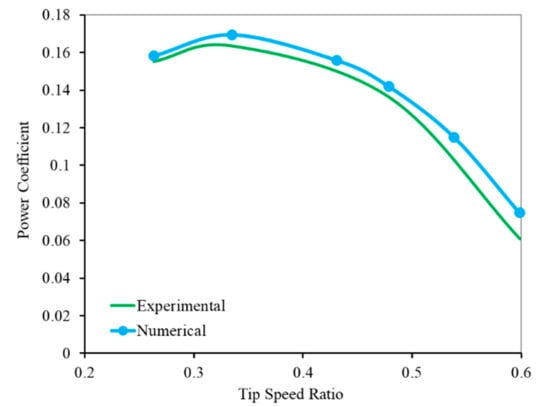 In this study, firstly, validation studies were carried out for the numerical solution method used with literature experimental data. In the validation studies, the experimental data of this type of turbines were taken into account due to the similarity of the vertical-axis wind turbine considered in the scope of the study to Savonius wind turbines with a drag-based and semicircular blade profile. For this reason, the turbine geometry, flow domain, and other conditions of the study with experimental data published in the literature were redesigned according to this literature information, and the performance data were determined numerically and compared. In this context, the accuracy of the numerical solution method was proven by comparing it with the experimental data given by Deda Altan and Atilgan []. In the validation studies, firstly, the mesh independence study was conducted. With this study, in particular, the initial mesh element number, for which the average torque coefficient values almost never change, was taken into account. Since the numerical analysis is dynamic, time stability and sensitivity studies were also performed. Within the scope of time step stability studies of numerical analysis, it was determined that the tour time intervals where the data obtained for a full tour of the turbine were almost the same, i.e., stable performance values were also calculated from these stable turbine tours. In the time step sensitivity studies of numerical analysis, time steps were also determined, for which the average values of the data obtained in a stable full tour were almost the same. Thus, the time independence of the analysis results obtained was ensured. The experimental and numerical variation of the power coefficient of the Savonius wind turbine at different tip speed ratios is shown in Figure 5. As can be seen in the figure, it was found that the numerical data obtained for the Savonius turbine were generally quite compatible agreement with the experimental data. Thus, the validation of the numerical analysis method was proven. Throughout this study, the numerical analysis method, the validation of which was proven, was used.