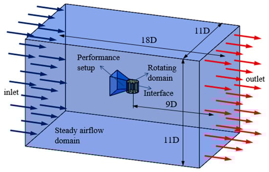 In this study, performance analyses were performed with the numerical solution method verified by experimental data under the same conditions by only changing the vertical-axis wind turbine and adding the performance setup. Therefore, the same turbulence model as the standard k-ε turbulence model was used in optimization and performance studies. In the same way, the same grid method was also used as the grid method of numerical analysis. In the optimization and performance analysis studies, the wind speed was selected as 8 m/s. As shown in Figure 6, the dimensions of the flow domain were determined by the diameter of the three-bladed vertical-axis wind turbine. As can be seen in the figure, the flow domain consists of two types of fields: a rotating flow domain and a steady flow domain. For the dynamic analysis of the vertical-axis wind turbine, an interface was created between the rotating flow field and the steady flow field. In this way, the interaction between the incoming wind flow and the vertical-axis wind turbine rotating around itself was provided. In order to avoid blockage effect, the cross-sectional dimensions of the flow domain were taken as 11Dx11D. For flow stability, the total flow domain length was taken as 18D. Therefore, with the validated numerical solution method, the turbine performance values obtained at different geometric parameters were compared with each other, and the optimum turbine performance was obtained.