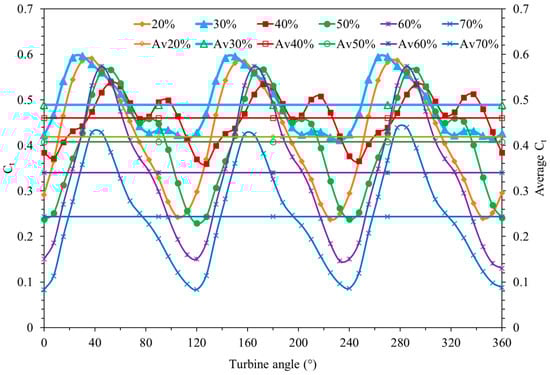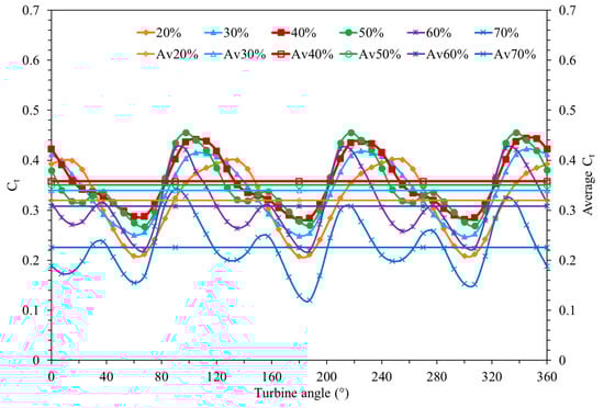 The changes and average values (Av20%-Av70%) of the torque coefficients obtained from three-bladed vertical-axis wind turbines with the same gap ratios (20–70%) using the performance setup are shown in Figure 8. In order to compare the turbine torque coefficients obtained at different gap ratios in both the use and non-use of the performance setup, the turbine tip speed ratio was the same, i.e., λ = 0.33. Especially when the turbine average torque coefficients are taken into consideration, it was determined that the torque coefficient values obtained from the turbine increased with the gap ratio increasing up to 30% and decreased from this gap ratio onwards. Considering the maximum and minimum torque coefficient values obtained in a full rotation of the turbine, the maximum torque coefficient values were obtained at 30% of the gap ratio. It was determined that the turbine torque coefficient value with a 30% gap turbine, where the maximum average torque coefficient was obtained, increased by 100% compared to the turbine with a 70% gap turbine, where the minimum average torque coefficient was obtained by using the performance setup.
