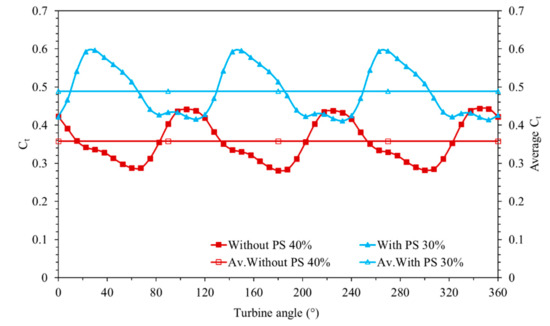 Figure 9 shows the maximum torque coefficient changes and average values obtained with and without the use of the performance setup (PS) at the same tip speed ratio. Accordingly, the maximum torque coefficient values were obtained with a turbine having a 30% gap ratio without the use of a performance setup. By using the performance setup, maximum torque coefficient values were obtained with a turbine having a 40% gap ratio. It was determined that the maximum average torque coefficient obtained with the use of the performance setup increased by 37% compared to the maximum average torque coefficient obtained without the use of the performance setup.