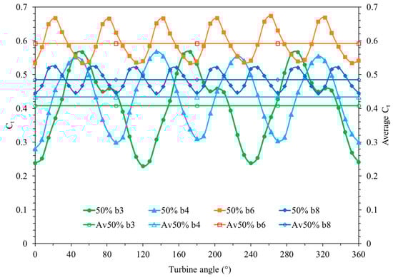 When the torque changes obtained from the 30% GR turbine given in Figure 8 were examined, it was determined that the maximum torque coefficients closest to the maximum torque coefficients obtained were obtained at 20%, 50%, and 60% GR. It was determined that the torque coefficient changes of the turbines with PS at 20% and 50% of GR were almost the same. However, it was found that the torque coefficient change values obtained from the turbine with the other GR value of 60% were smaller values. For all these reasons and due to the turbine blade design freedom, the blade addition improvement studies performed with a turbine with a PS of 50% GR at a tip speed ratio of λ = 0.33 are shown in Figure 11. As can be seen in the figure, increasing average torque coefficient values were obtained with the number of blades being three (b3), four (b4), and six (b6). With the number of blades being eight (b8), a lower torque coefficient value was obtained than the torque coefficient value obtained with the number of blades being six. Therefore, the maximum average torque coefficient and smoother variation were obtained from the six-bladed turbine with 50% GR. It was determined that the average torque coefficient value obtained with the six-bladed turbine was increased by approximately 45% compared to the torque coefficient value obtained from the three-bladed turbine.