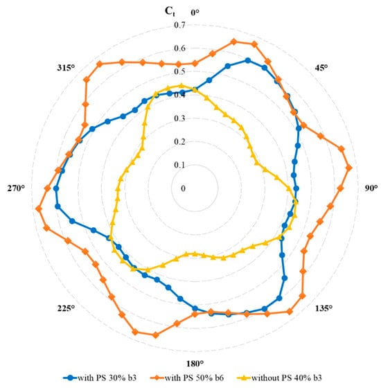 Figure 13 shows the change in the power coefficient obtained from optimum vertical-axis wind turbines with six blades and a 50% gap ratio with respect to the tip speed ratio in the case of PS and without PS. With the optimum vertical-axis wind turbine without PS, the maximum power coefficient was obtained around 0.15 at a tip speed ratio of approximately 0.41. With the optimum vertical-axis wind turbine with a performance setup, the maximum power coefficient of around 0.22 was obtained at a tip speed ratio of around 0.49. Thus, it was determined that the power coefficient obtained with the optimum six-bladed vertical-axis wind turbine with the performance setup was increased by approximately 46% compared to the power coefficient obtained from the turbine without the performance setup. When the studies in the literature were examined, it was determined that the power coefficient obtained from the vertical-axis turbines without the setup had a variable increase in performance compared to the power coefficients obtained from the vertical-axis turbines with a setup, depending on the conditions of the turbines and setups []. According to these studies, it was determined that the power coefficient increases were 22% with the v-shaped deflector setup, 27% with the guide box tunnel setup, 39% with the obstacle plate setup, and 21% with the conveyor curtain system setup [,,,]. In this study, it was determined that the 46% increase in power increase obtained by using the performance setup was at quite good levels, according to literature information.