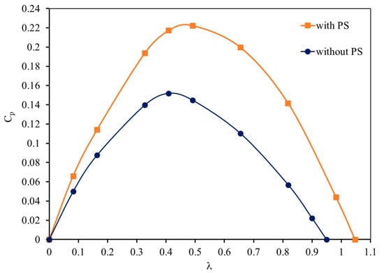 The power coefficients of a six-bladed vertical-axis wind turbine with and without PS with a 50% gap ratio.