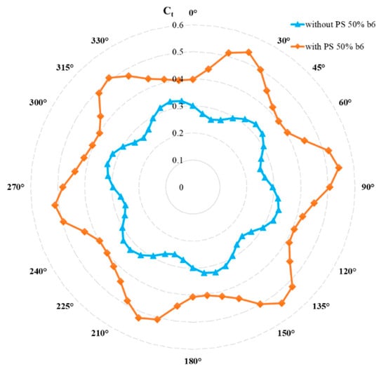The variation of torque coefficients at tip speed ratio λ = 0.49, where the maximum average power coefficient is obtained for optimum vertical-axis wind turbines with and without performance setup, is shown in Figure 14. As seen in the figure, it was determined that the torque coefficients obtained with the use of the six-bladed turbine performance setup were higher than those obtained without the setup. It was determined that, especially with the use of the performance setup, the torque coefficient values in the lower regions of the torque coefficient changes obtained without the setup increased. At this tip speed ratio, the average torque coefficient value was increased by approximately 55% with the performance setup.