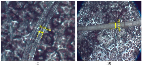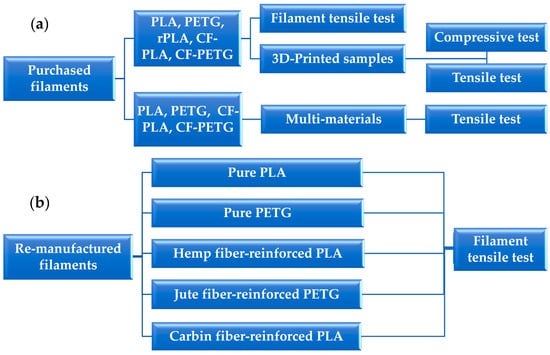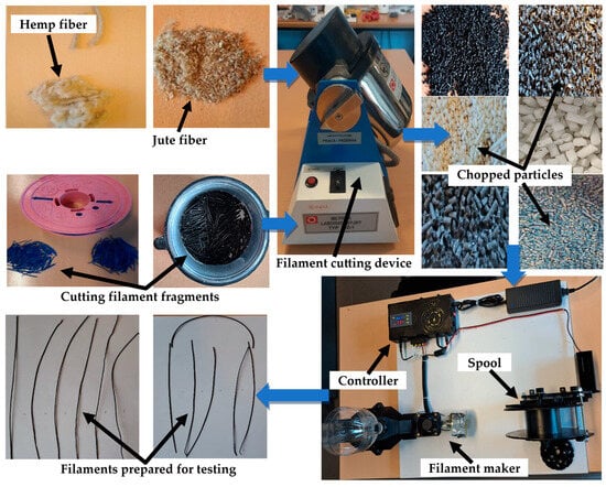 To ensure the resulting filament meets specific quality, performance, and application-related criteria, it is essential to determine the dimensions of small hemp pieces and the diameter of jute fibers before transforming them into filament form. Under 10 × 10 magnification, the microscope provided the following detailed measurements: the hemp fiber length was 35.05 μm, the width was 23.78 μm, and the jute fiber diameter measured 79.71 μm (see Figure 1c,d). Figure 2 presents a schematic roadmap that clarifies the distinction between the materials used, specifying which were purchased, which were employed in multi-material designs, and which were recycled, along with the tests performed on each group.