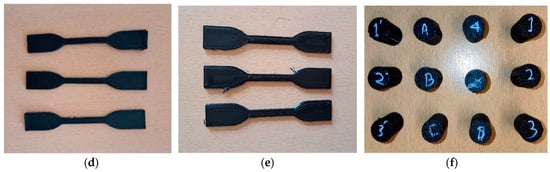 Actual appearance of various additively manufactured tensile and compressive test specimens created with original filaments: (a) rPLA, (b) PLA, (c) PETG, (d) CF–PLA, and (e) CF–PETG. (f) Displays the compressive specimens for all materials.