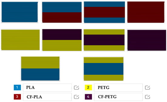 Tensile specimens of single-gradient composites, denoted as PLA/CF–PLA and PETG/CF–PETG, consisted of 50% PLA and 50% CF–PLA, and 50% PETG and 50% CF–PETG, as well as 50% PLA and 50% PETG. Additionally, the multi-gradient composites were created using the following two specific combinations: PLA/CF–PLA (PCFP) and PETG/CF–PETG (GCFG). The PLA/CF–PLA setup featured 25% PLA on the outer layers and 50% CF–PLA in the central core (PCFPP). For the PETG/CF–PETG combination, 25% PETG was used for the outer layers with 50% CF–PETG as the core (GCFGG). Another variant, the PETG/PLA composite, included 25% PETG on the outer layers and 50% PLA in the inner core (GPG). For comparison, additively manufactured samples of pure neat PLA, PETG, CF–PLA, and CF–PETG were also prepared, and their properties were assessed alongside various gradient composites. The selection of the multi-material design samples was based on optimizing material properties for specific structural applications. The choice was influenced by prior studies that demonstrated the benefits of combining materials with different mechanical characteristics to enhance overall performance [37,38]. Figure 6 displays the schematic of the functional grading sequences for various PLA, PETG, and CF–PLA–CF–PETG composite layers. The samples were created with different gradient stacking arrangements, including both single- and multi-gradient setups with varying percentages of stacking layers.