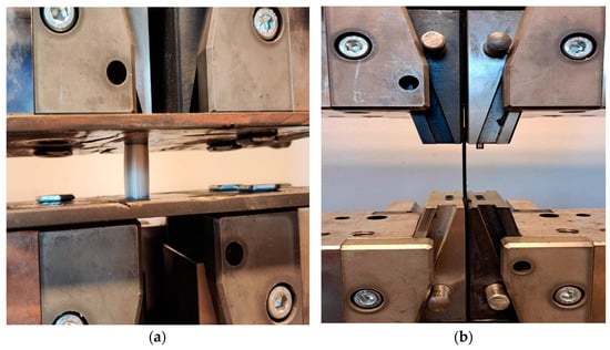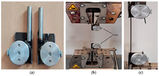 In this study, the tensile properties of the original filaments (not printed specimens and 3D specimens) and the re-manufactured filaments (not printed into a specimen), such as ultimate tensile strength and fracture strength, were determined at a crosshead speed of 5 mm/min, with a minimum of five repetitions for each test. Filaments of 300 mm in length were clamped using Bollard-style grips (see Figure 7). The Bollard part of the fixture had a diameter of 120 mm, consisting of two cylindrical grips mounted on a Zwick Roell Z100 tensile testing machine (Ulm, Germany). Testing was performed at a displacement rate of 5 mm/min, with a distance of 150 mm between the grips. One grip was secured in place, while the other was adjustable. The adjustable grip was attached to the load cell of the testing machine, which recorded the force exerted on the specimen.