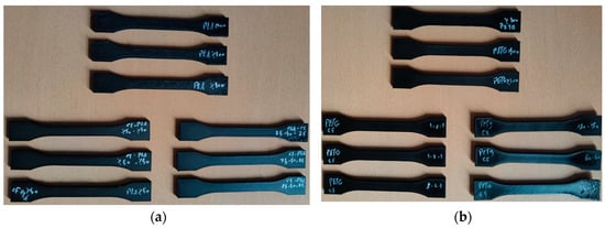 Physical appearance of selected tensile specimens: (a) PLA and CF–PLA, and (b) PETG and CF–PETG.