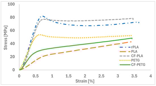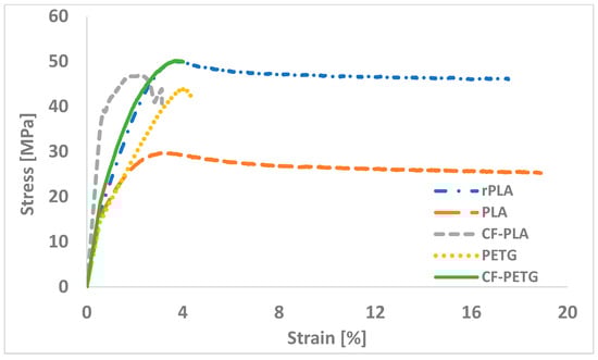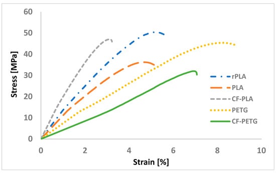 Tensile testing was conducted on the original filament material, which had not undergone extrusion during the printing process. Figure 10 presents the stress–strain curves for the five different filament materials. The figure provides one representative result out of the three tests conducted for each material.