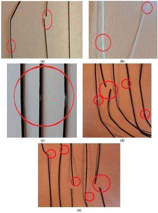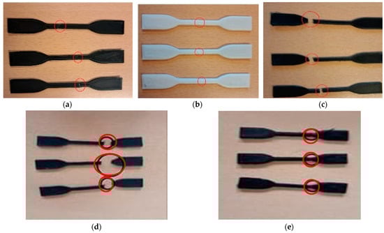 Specimens after tensile tests: (a) rPLA, (b) PLA, (c) CF–PLA, (d) PETG, and (e) CF–PETG. The red circles indicate the areas of failure.