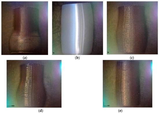 The morphology of the compressed samples following the compressive test: (a) rPLA, (b) PLA, (c) CF–PLA, (d) PETG, and (e) CF–PETG.