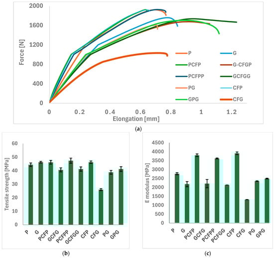 Tensile testing results: (a) Load-elongation curves, (b) tensile strength values, and (c) E-modulus measurements.