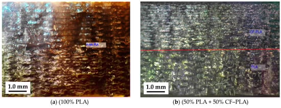 - Specimens made entirely of CF–PLA showed a tensile modulus of 3914 MPa, while a 50% PLA + 50% CF–PLA multi-material composite demonstrated effective reinforcement with a tensile modulus of 3805 MPa. However, 100% CF–PETG had the lowest tensile modulus at 1318 MPa, pointing to potential fiber-matrix interaction issues.