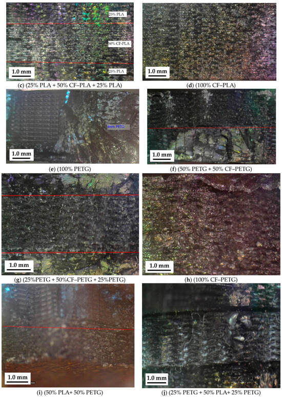 Optical microscope images of the fractured surfaces of the neat, single, and multi-graded composite material specimens are presented in Figure 17. The fractured surfaces of PLA appeared brittle, as indicated by the clear and sharp fracture edges. The fracture process exhibited deformation and elongation of the PETG, highlighting an increase in toughness (Figure 17d). Moreover, the fracture of the PLA matrix within the CFPLA layers exhibited brittleness, and clear gaps between the PLA substrate and the carbon fibers suggested an inadequate bonding interface (Figure 17d). In CF–PETG, noticeable structural changes around the fibers can be observed, demonstrating how the stiffness of PETG interacts with the gritty texture of the carbon fibers (Figure 17h). The composite specimens manufactured by PLA mixed with PETG exhibited a clear, sharp boundary between the different parts. This difference in behavior between the materials can create some pressure, possibly causing the layers to separate (see Figure 17j).