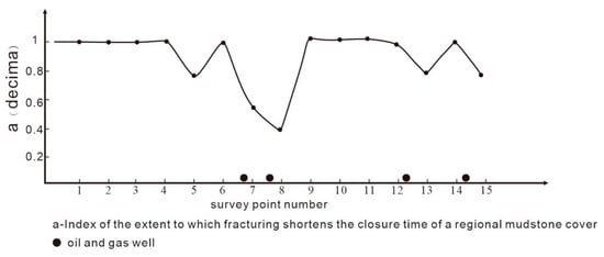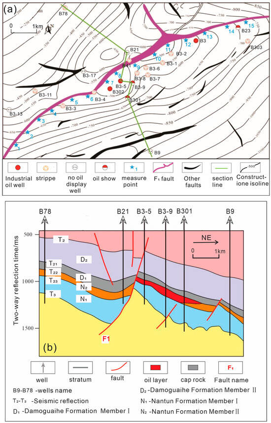 - At measurement points 1–4, 6, and 9–11 in the western Beier Depression of the Hailar Basin, faults shorten the blocking time of the regional mudstone cap in the section by 100%, which is unfavorable for hydrocarbon accumulation and preservation in the N2 section, resulting in no oil and gas displays from drilling. The F1 fault at measurement points 5, 7, 8, and 12–15 shortens the blocking time by 37% to 99%, making it more favorable for hydrocarbon accumulation and preservation in the N2 section, with successful oil and gas shows at points 7, 8, 12, and 14. However, at points 5, 13, and 15, no oil and gas shows were detected, likely due to an insufficient supply of hydrocarbons in these lower structural positions.