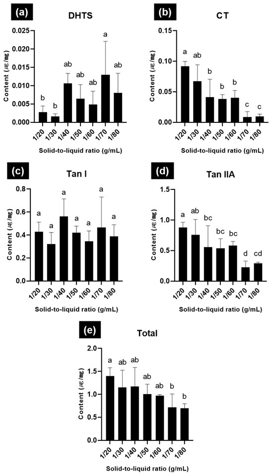 Effect of solid-to-liquid ratio on the tanshinone content in surfactant layer. (a) Dihydrotanshinone I (DHTS) content for each ratio; (b) cryptotanshinone (CT) content for each ratio; (c) tanshinone I (Tan I) content for each ratio; (d) tanshinone IIA (Tan IIA) content for each ratio; (e) total content for each ratio. Means with different letters in the same column are significantly different by Duncan’s multiple range test (DMRT, p < 0.05). (Lecithin concentration: 5%, w/v; NaCl concentration: 5%, w/v; pH: 3; equilibrium temperature: 40 °C).