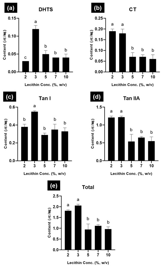 Effect of surfactant concentration on the tanshinone content in surfactant layer. Conc. denotes concentration. (a) Dihydrotanshinone I (DHTS) content for each ratio; (b) cryptotanshinone (CT) content for each ratio; (c) tanshinone I (Tan I) content for each ratio; (d) tanshinone IIA (Tan IIA) content for each ratio; (e) total content for each ratio. Means with different letters in the same column are significantly different by Duncan’s multiple range test (DMRT, p < 0.05). (Solid-to-liquid ratio: 1 g/20 mL; NaCl concentration: 5%, w/v; pH: 3; equilibrium temperature: 40 °C).
