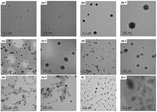 Transmission electron microscopy (TEM) images of micelle formed by lecithin concentration. (a,a-1) TEM images of micelles of 2% lecithin in water; (b,b-1) TEM images of micelles of 3% lecithin in water; (c,c-1) TEM images of micelles of 5% lecithin in water; (d,d-1) TEM images of micelles of 7% lecithin in water; (e,e-1) TEM images of micelles of 10% lecithin in water; (f) TEM image of lyophilized 3% lecithin control micelles in water; (f-1) TEM image of non-lyophilized 3% lecithin control micelles in water. (Solid-to-liquid ratio: 1 g/20 mL; NaCl concentration: 5%, w/v; pH: 3; equilibrium temperature: 40 °C).