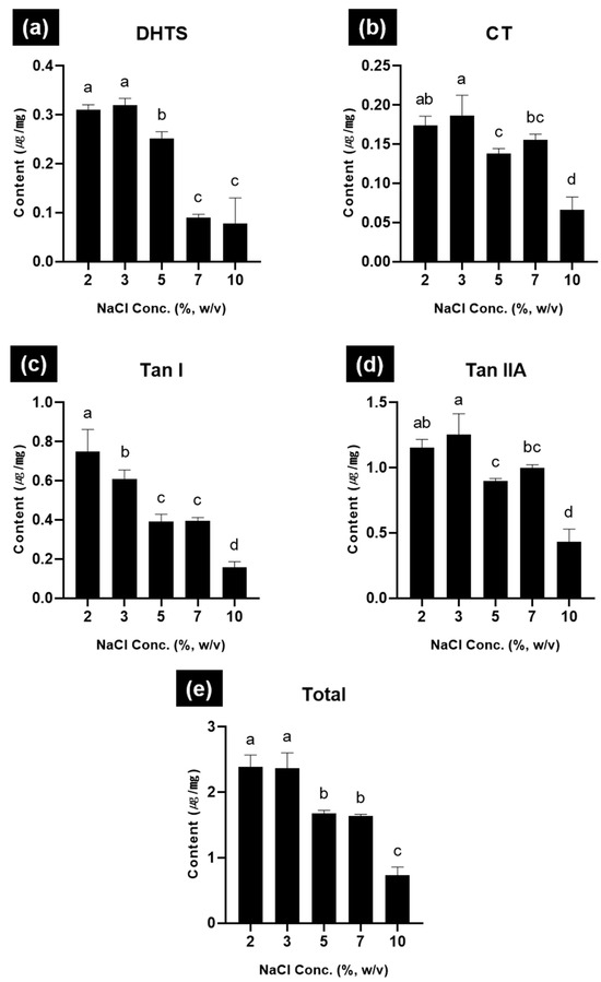 Effect of NaCl concentration on tanshinone content in surfactant layer. Conc. denotes concentration. (a) Dihydrotanshinone I (DHTS) content for each ratio; (b) cryptotanshinone (CT) content for each ratio; (c) tanshinone I (Tan I) content for each ratio; (d) tanshinone IIA (Tan IIA) content for each ratio; (e) total content for each ratio. Means with different letters in the same column are significantly different by Duncan’s multiple range test (DMRT, p < 0.05). (Solid-to-liquid ratio: 1 g/20 mL; Lecithin concentration: 3%, w/v; pH: 3; equilibrium temperature: 40 °C).