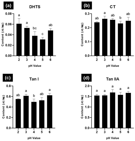For DHTS, the content decreased as the pH increased (Figure 5a). Tan IIA did not exhibit significant differences across all ranges (Figure 5d). While CT and Tan I showed statistically significant differences, the differences were not large enough to be practically noticeable (Figure 5b,c). CPE efficiency is generally pH-dependent, influencing complex formation [52]. For neutral or non-ionic compounds, the impact of pH change is minimal [53], a conclusion supported by Bi et al. [27], who isolated CT and Tan I from SM using Triton X-100.