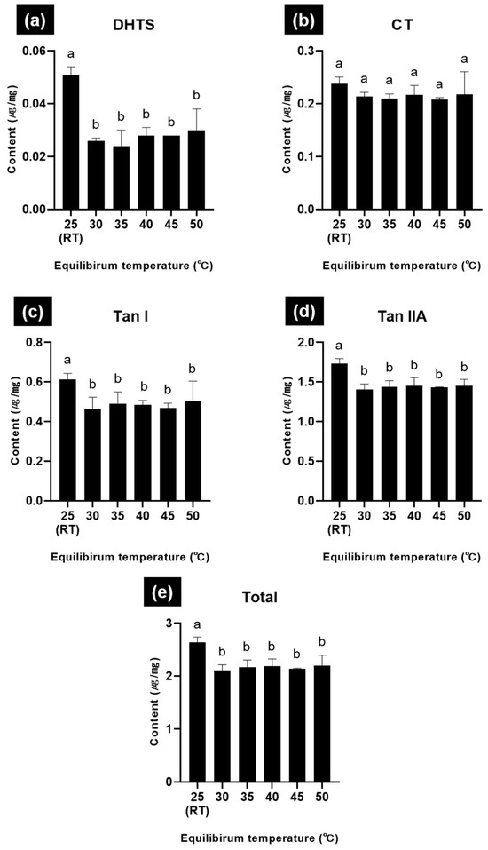 Effect of equilibrium temperature on tanshinone content in surfactant layer. RT denotes room temperature. (a) Dihydrotanshinone I (DHTS) content for each ratio; (b) cryptotanshinone (CT) content for each ratio; (c) tanshinone I (Tan I) content for each ratio; (d) tanshinone IIA (Tan IIA) content for each ratio; (e) total content for each ratio. Means with different letters in the same column are significantly different by Duncan’s multiple range test (DMRT, p < 0.05). (Solid-to-liquid ratio: 1 g/20 mL; Lecithin concentration: 3%, w/v; NaCl concentration: 2%, w/v; pH: 6).