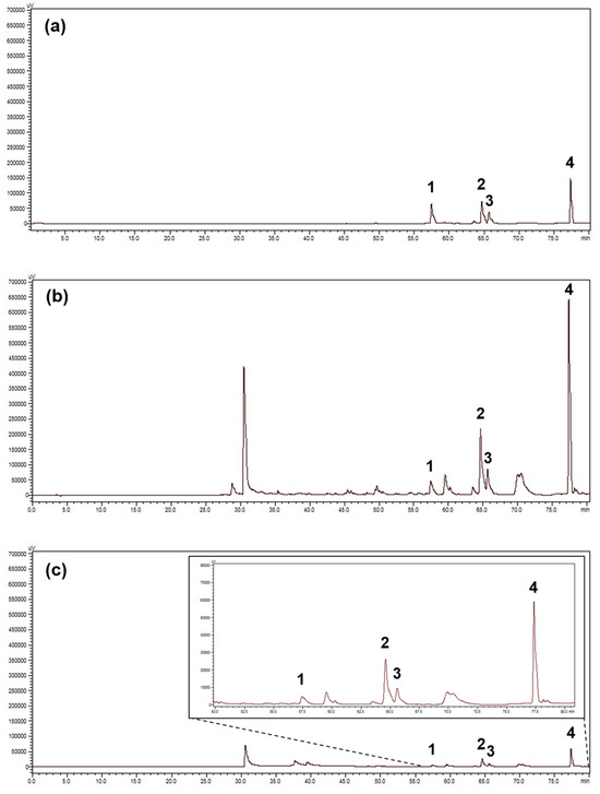 The standard curves and coefficients of determination for each component are shown in Table 1. The results confirm the method’s suitability for both quantitative and qualitative analysis, validating its linearity and accuracy.