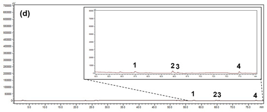 (a) HPLC chromatogram of four tanshinones standard mixtures (50 μg/mL, 1 Dihydrotanshinone I (DHTS); 2 Cryptotanshinone (CT); 3 Tanshinone I (Tan I); 4 Tanshinone IIA (Tan IIA)); (b) HPLC chromatogram of SM 5% A.A + EtOH; (c) HPLC chromatogram of SM–CPE; (d) HPLC chromatogram of SMW.