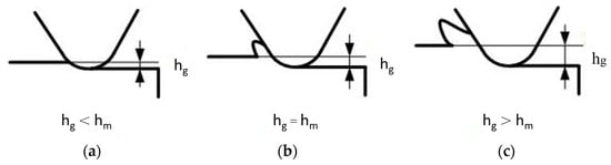 The geometric model of the scratch and scribe type of micro-sized abrasive particles is shown in Figure 3. The brake pad is composed of an isotropic copper-based plastic material, and the contact area with the abrasive particles is in the order of micrometers in size. The abrasive particle is also in the order of microns. The symbol “hg” represents the actual scratch depth of the abrasive particle and its unit is micrometer. The symbol “hm” represents the critical scratch depth of the abrasive particle wear, and its unit is also micrometer.