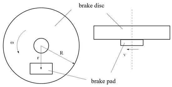 A model of the main motion of the disc brake is shown in Figure 4. The motion of the macro-scale wind disc brake rotation at a certain speed n at a certain moment in time. It can be seen that the brake pad slides relative to the brake disc at a certain linear velocity v.