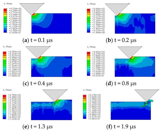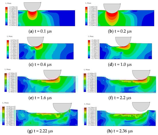 Figure 6 shows the change in the stress of the brake pad material during scratch wear. Figure 6a,b show the equivalent stress distribution on the material surface when the abrasive particle is pressed into the brake pad. The stress distribution is concentrated below the abrasive particle. As shown in Figure 6c–f, when the abrasive particle slides laterally, the material is affected by the tangential braking load and friction force transmitted by the abrasive particle, and the surface stress increases. It is also concentrated in the tangential slip direction of the abrasive particle. The abrasive scraping layer forms a significant stress concentration, and the surface material undergoes a severe extrusion-plastic flow behavior. In Figure 6g,h, it is observed that the material surface is no longer affected by the external load after the abrasive particle is disengaged, while the equivalent stress of the brake pad material surface has not disappeared. The surface stress of the brake pad material mainly consists of residual stress. The residual stress concentration distribution can be clearly observed in Figure 6h. After the brake is unloaded, the residual stress will be cumulatively applied to the brake pad material during the next braking process. This part of the material is prone to fatigue damage under cyclic loading to form short-cycle fatigue wear when the abrasive particle is scratched several times, and this is also the main reason for the scratch-type abrasive particles forming short-cycle fatigue wear. Regarding abrasive wear caused by scratching, similar results were also analyzed by adding a third body in the study []. The main source of abrasive wear is the damage to the friction surface caused by scratching or third-body scratching.