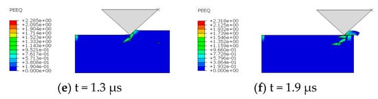 The equivalent plastic strain nephogram during the scribe-type abrasive wear process is shown in Figure 7. When the scribed abrasive particle begins to press the surface of the brake pad material as shown in Figure 7a, the material undergoes tangential extrusion deformation under the effect of tangential braking load and friction force. The plastic strain on the surface of the material is mainly concentrated in front of the angle of attack of the abrasive particle, while the material below the abrasive particle is less deformed, and the plastic strain distribution of the material produced by the scribed abrasive particle is not conspicuously generated plastic strain diffusion. As shown in Figure 7b,c, the wear process produces small friction crumbs due to the scribing of the abrasive particle. As shown in Figure 7d,e, the abrasive particle continues to scratch the surface of the copper-based material and the friction crumbs gradually become larger. As shown in Figure 7f, the wear process produces a continuous improvement when the abrasive particle reaches a stable scribing stage. Large friction crumbs result in scribe-type abrasive wear.