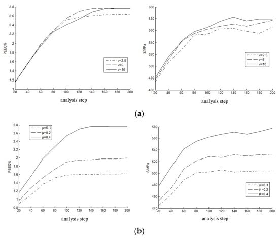 Influence of braking parameters on the strain/stress of scratch-type abrasive wear. (a) Strain/stress changes with different braking speeds. (b) Strain/stress changes with different friction coefficients.